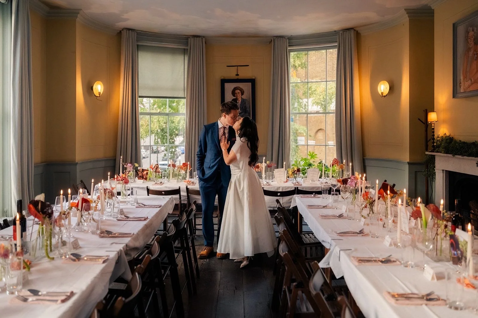 Chris and Becky envisioned their wedding as an intimate “date night with family and friends,” set in the London suburb where they first met — Islington, a place that also holds personal meaning for me. The result was a celebration that was effortlessly charming, chic, and quintessentially London. Every detail reflected their love story and created a warm, unforgettable experience for their guests.